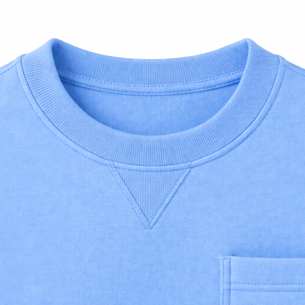Classic crew neckline with back neck taping for improved shape retention and long-term durability.